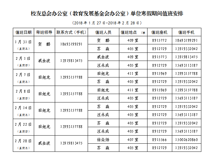 校友总会办公室(教育发展基金会办公室)单位寒假期间值班安排