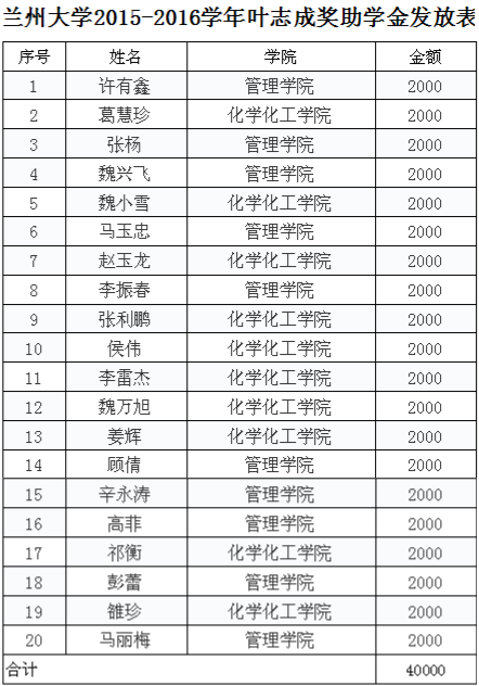 根据叶志成基金会与我校协议,经个人申请、学院学校审批,资助方审核,最终确定获得2015-2016学年兰州大学叶志成奖助学金人员名单,现将获奖名单公示如下: