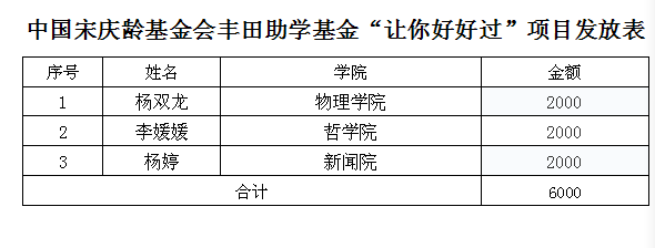 根据中国宋庆龄基金会与我校协议,经个人申请、学院学校审批,资助方审核,最终确定获得2016学年中国宋庆龄基金会丰田助学基金“让你好好过”项目资金人员名单,现将获奖名单公示如下: