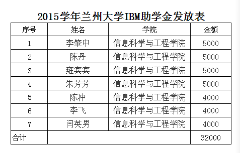 根据IBM中国大学合作部与我校协议,经个人申请、学院学校审批,资助方审核,最终确定获得2015学年兰州大学IBM助学金的人员名单,现将获奖名单公示如下: