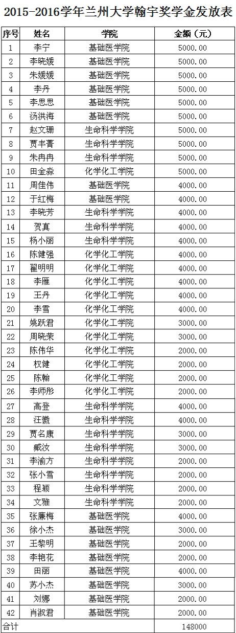 根据深圳翰宇药业股份有限公司与我校协议,经个人申请、学院学校审批,资助方审核,最终确定获得2015-2016学年兰州大学翰宇奖学金人员名单,现将获奖名单公示如下: